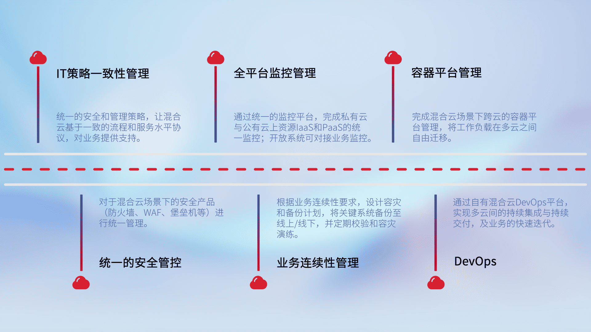 通过多云纳管,,,,以统一的资源数据模型把客户的云资源进行抽象和封装,,进而实现对多云资源的统一操作,,保障云资源管理的可靠性、、、稳定性与可用性。。。。量身定制化运维内容,,,配置、、、、开发运维、、、、补丁管理、、、备份、、监控、、、、认证和访问管理、、审计和日常巡检等,,保障在用云过程中的可靠度,,,,稳定度以及高可用率。。。。