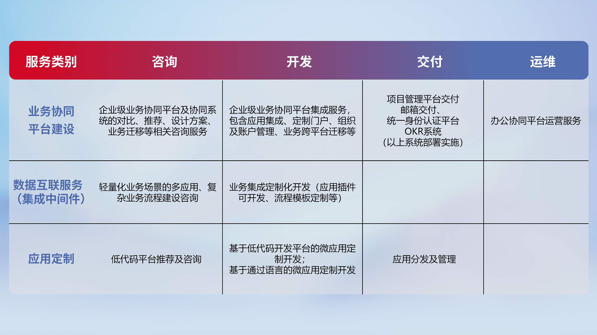针对钉钉、、、企微、、IDaas等平台级产品提供产品的规划、、、方案、、交付、、、定制化开发等服务,,实现如统一协同办公、、智能客户服务、、、、混合会议管理、、、、智能数据查询、、等业务场景,,实现数字化转型。。。。